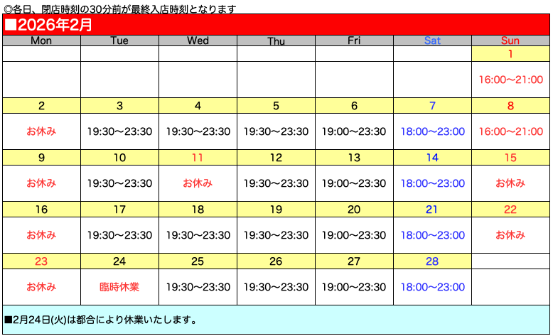 営業予定は変更になる場合もございます。